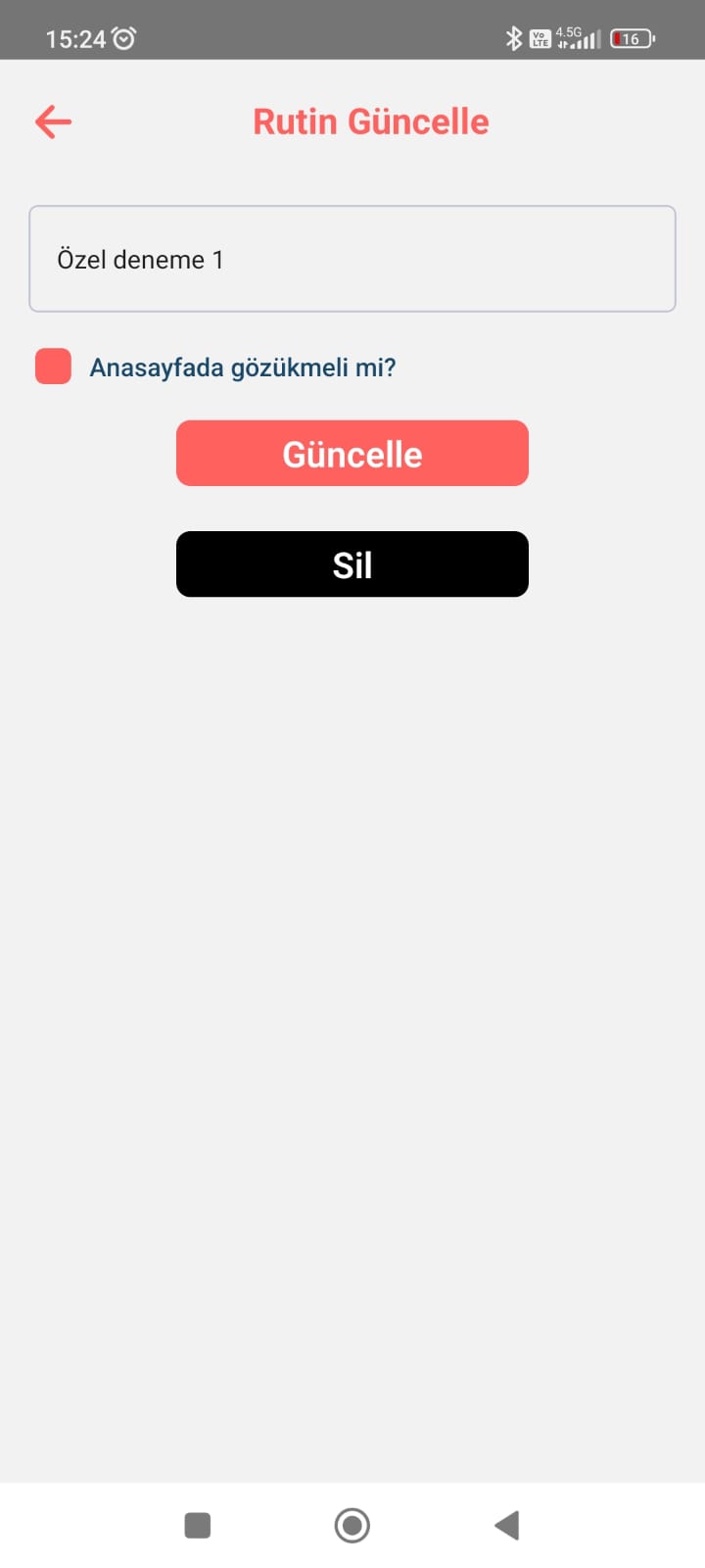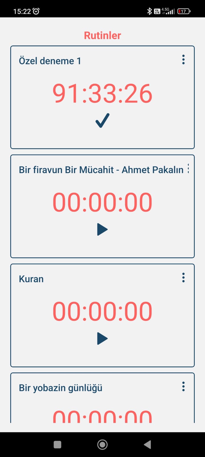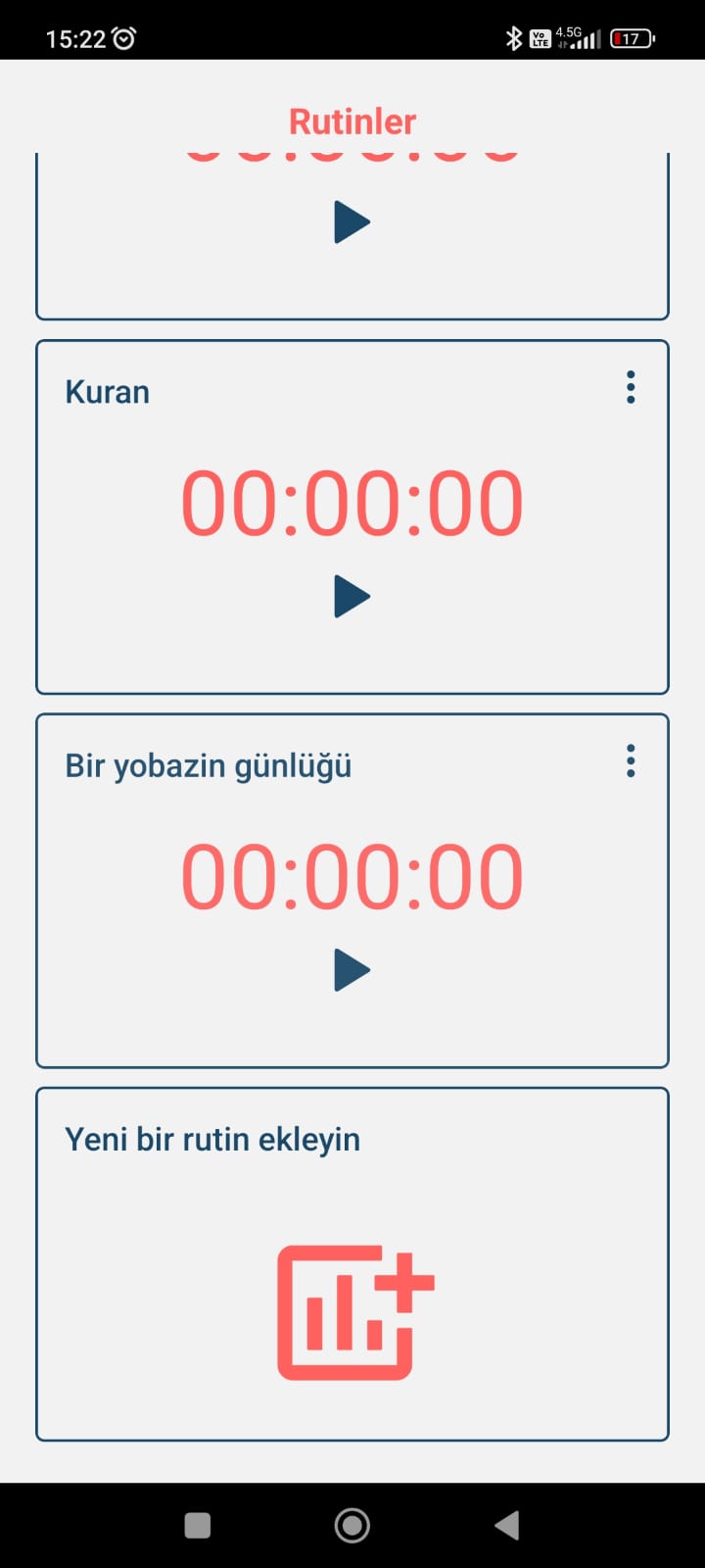 Uygulama basit bir arayüzden oluşuyor. Aşağıda görüldüğü gibi İlk olarak rutinlerimizi uygulamada kaydediyoruz. Burada rutinler ve timer cihaz bazlı kaydediliyor. İlk olarak uygulama açıldığında cihaza ait tekil adresi ve cihaz bilgisi veritabanına kaydediliyor (Mysql) kaydedildikten sonra Yeni bir rutin ekleyin kartına tıkladıktan sonra bizleri rutin ekleme sayfasına yönlendiriyor. Burada rutin adını ve anasayfa da gözüküp gözükmemesini seçiyoruz. Akabinde kaydettikten sonra artık rutin için harcadığımız süreleri başlatabiliriz. Play tuşu ile süreyi başlatıyoruz. Süre başladıktan sonra ise Play tuşu Check ikonuna dönüşmektedir. Check butonuna basarak rutini durdurabiliriz. Anasayfada gözüken süreler Play tuşuna bastıktan şimdiki zamana kadar olan süreyi göstermektedir. Rutine ait güncellemeleri yapmak için kartlar üzerinden bulunan sağ üst köşedeki 3 noktaya tıklayarak rutine ait güncelleme yapabiliriz, Rutine ait detaylarını inceleyebiliriz veya rutini listemizde silebiliriz.