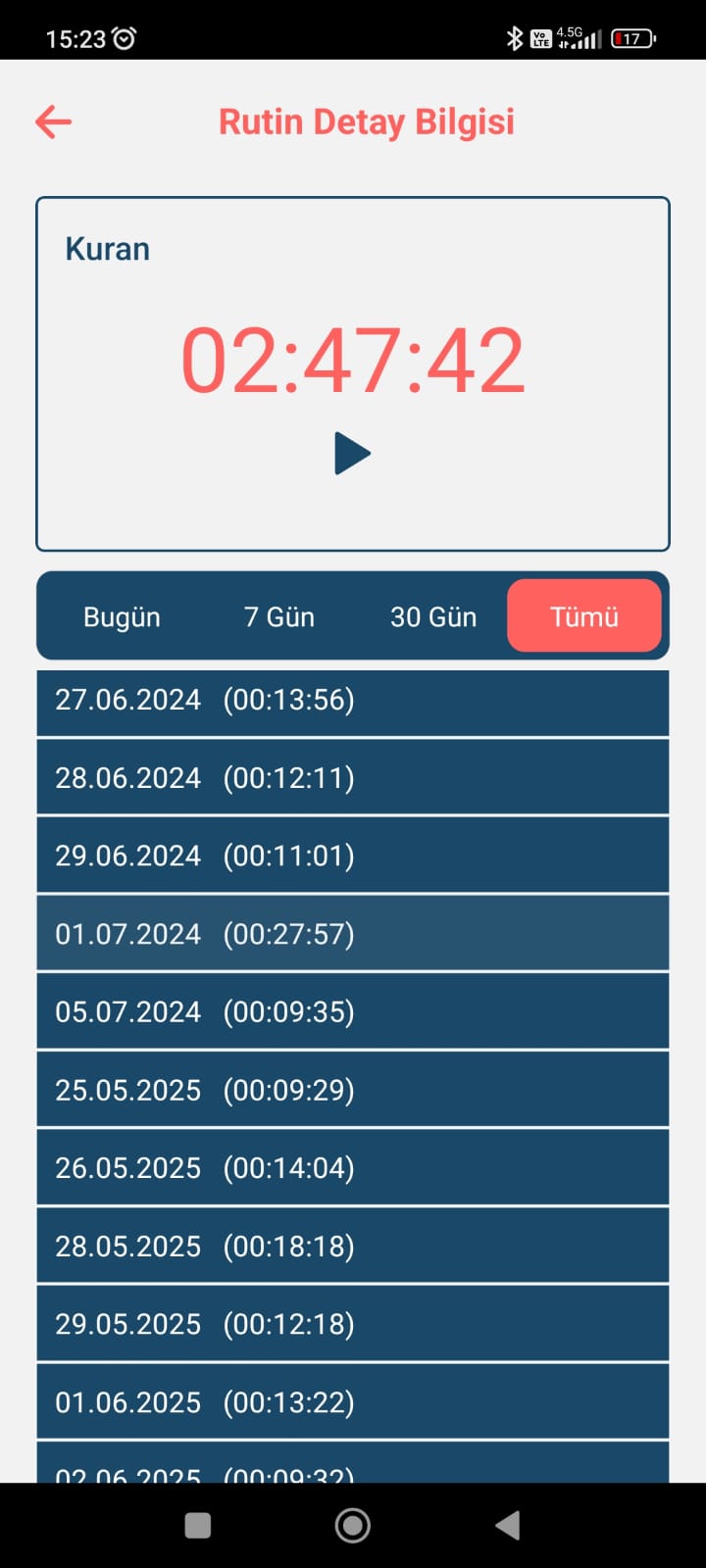 Rutine ait detayları incelerken aşağıdaki gibi 4 farklı zaman diliminde takip edebiliriz. İstersek sadece bugüne ait olanı takip edebiliriz, bugüne ait olanı takip ettiğimizde Süre kısmında bugün harcanan vakti gösterir. İstersek son 7 gündeki harcanan zamanları gösterebiliriz burada son 7 günde ne kadar harcandığını toplam kaç kere çalıştırıldığı, çalıştırırkne harcanan süreleride takip edebilmekteyiz, aynı matnıkla Son 30 gün ve tümü içinde aynı mantıkla çalışmaktadır. Untiltime uygulamasında görüldüğü gibi parantez içerisinde yazılan süre o gün harcanan süreyi temsil etmektedir. Satıra tıkladığımızda ise o gün kaç kere çalıştırıldığı çalıştırılanlar kaç dakika çalıştırıldığı bilgisini de göstermekteyiz.